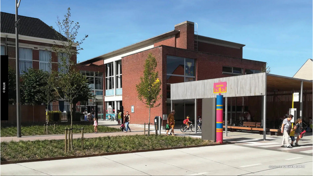 Schoolchildren had to make their way to school along the busy street with many obstacles and no safe infrastructure for cyclists and pedestrians. Reason enough for the municipality to tackle the school environment as a priority during the 2017-2018 village centre renovation. The combination of a smart design with raised squares and new regulations, including the introduction of a ‘30 zone’, brought about a change in the dominant position of the car. Parking spaces within a radius of 150 metres from the school gates were replaced by an awning with generous bicycle parking space. In addition, space was provided to park cargo bicycles and a kiss-and-ride zone was incorporated. An existing green strip was turned into a garden.